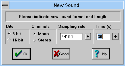 l'acquisition du signal se fait en 44100 Hz, 8 bits, Mono. Avec GoldWave, commencez par créer un fichier son comme suit :
