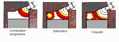 La combustion du mélange commence normalement après l'étincelle. Le front de flamme se propage et son souffle repousse une partie du mélange contre les parois du cylindre et le sommet du piston. L'élévation de pression et de température devient tellement importante que le combustible coincé contre les parois atteint son point d'auto-allumage et s'auto enflamme à plusieurs endroits.
