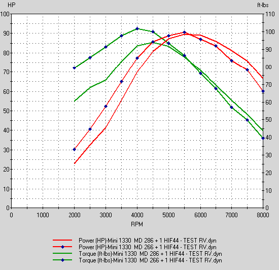 Mini 1330 culasse stage 3 (soupapes 35.6/31) avec un carburateur HIF 44 et une rampe de culbuteur standard. Comparaison de deux arbres à came différents (266 et 286) avec un rapport volumétrique fixe de 10:1