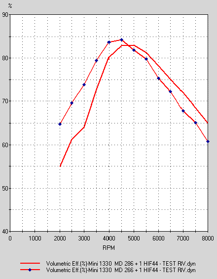 Pour obtenir la même efficacité volumétrique maximum avec un 286 qu'avec un 266 (idem pour la PME), il faut porter le rapport volumétrique à 11. Curieusement, si on porte le RV à 11, le rapport géométrique passe à 8.6, c'est à dire presque le même qu'avec un 266 et un rapport volumétrique de 10.